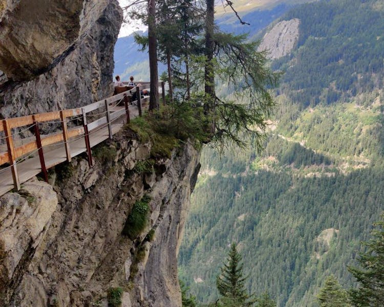 The trail starts at the Lac de Tseuzier (1,777 m), an emerald reservoir nestled in a dramatic cirque of peaks. From here, the path follows the historic bisse carved into steep cliffs, crossing wooden galleries, tunnels, and bridges with sweeping views over the Rhône Valley. The mix of forest, rock passages, and panoramic viewpoints makes this route one of the most impressive in Valais.