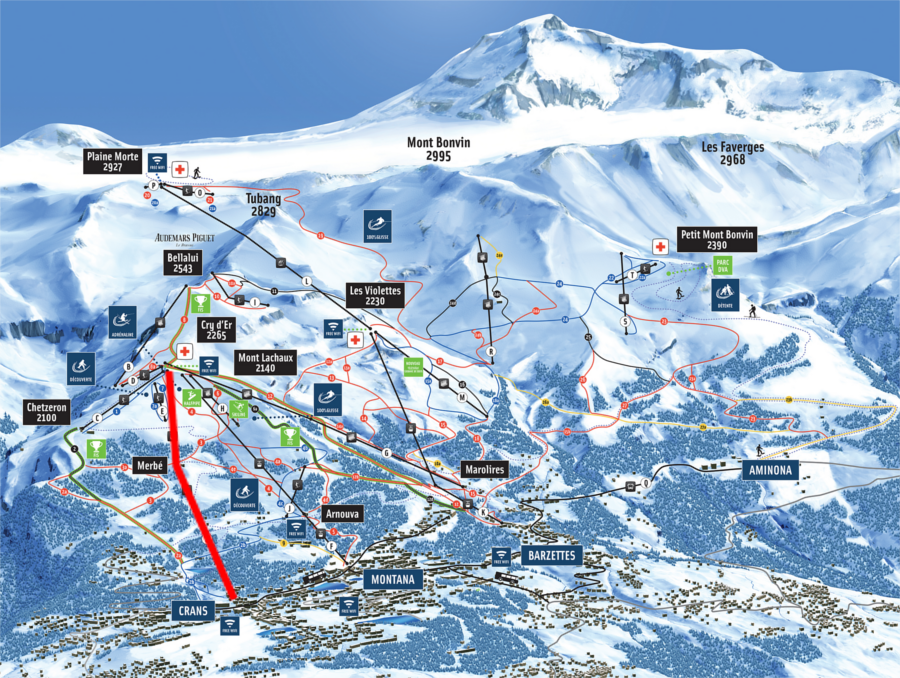The base station, which takes you up to Cry d’Er at 2,200 meters, is just a short walk away. It’s easily accessible via the blue cable cars departing from Crans. Cry d’Er is a unique spot offering an exceptional panoramic view of the Alpine peaks, including the Matterhorn and Mont Blanc.