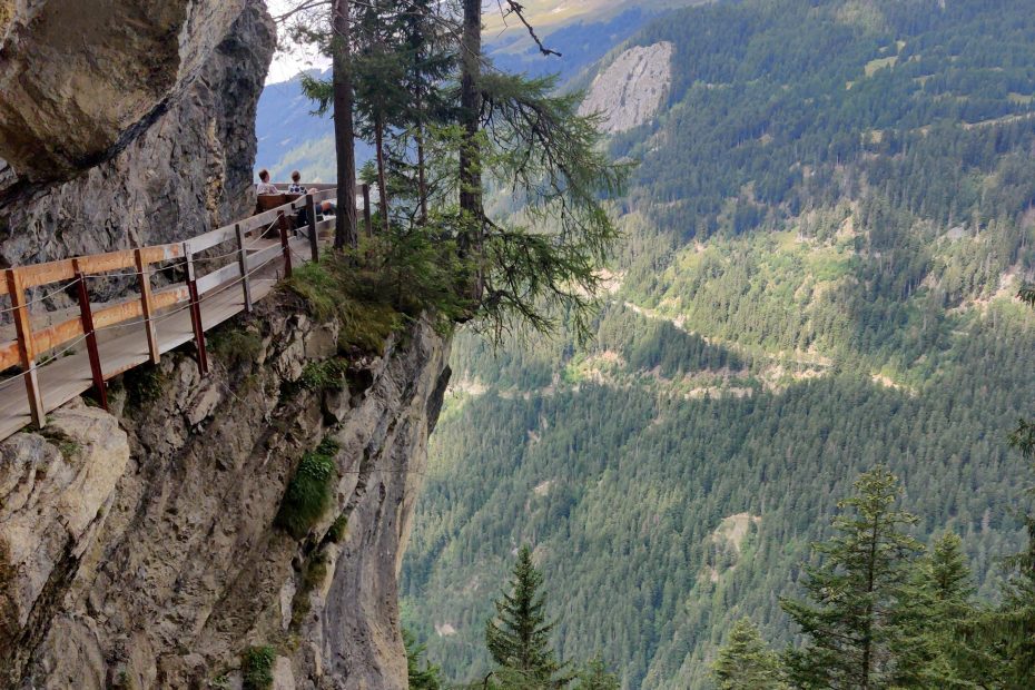 The trail starts at the Lac de Tseuzier (1,777 m), an emerald reservoir nestled in a dramatic cirque of peaks. From here, the path follows the historic bisse carved into steep cliffs, crossing wooden galleries, tunnels, and bridges with sweeping views over the Rhône Valley. The mix of forest, rock passages, and panoramic viewpoints makes this route one of the most impressive in Valais.