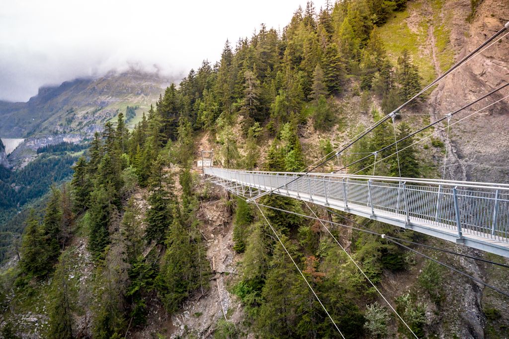 The trail starts at the Lac de Tseuzier (1,777 m), an emerald reservoir nestled in a dramatic cirque of peaks. From here, the path follows the historic bisse carved into steep cliffs, crossing wooden galleries, tunnels, and bridges with sweeping views over the Rhône Valley. The mix of forest, rock passages, and panoramic viewpoints makes this route one of the most impressive in Valais.